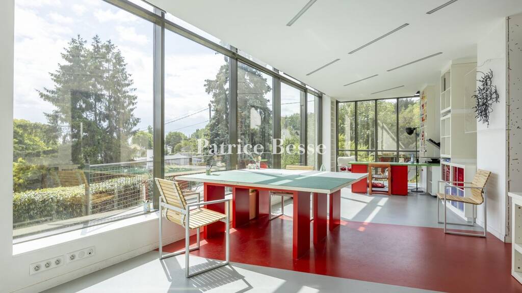 The houseThe house offers around 200 m² of living space over four levels. From the basement to the top floor, the design emphasis is on modernity, light, colour and comfort. On the ground floor, the 80 m² reception room is virtually suspended above the landscaped garden, and benefits from an intelligent layout with plenty of built-in storage space. An unpolished oak staircase leads from the basement to the upper floors. The first floor comprises a 15 m² bedroom, a 45 m² workshop with bespoke storage and shelving areas and a terrace, a small additional study and a bathroom with two windows. The top floor, approx. 30 m², features a single room enhanced by a vast, unoverlooked terrace offering exceptional views over the treetops, a few rooftops and the city in the distance. The basement comprises a cellar and a large room that could be used as an office for a freelance professional activity thanks to its separate entrance. There remains a great deal of potential for creating unique family, professional or artistic premises just twenty or so kilometres from the capital.