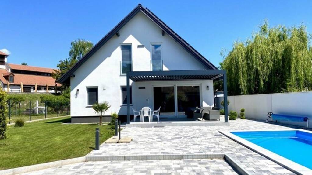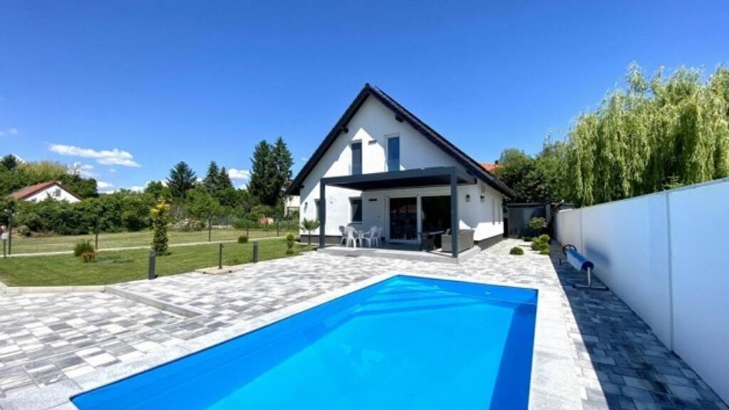 Energieausweis: ZU DIESER IMMOBILIE LIEGT DERZEIT NOCH KEIN ENERGIEAUSWEIS VOR. IN VORBEREITUNG. Haus mit Pool Das fragliche Backsteingebäude wurde im Jahr 2021 gebaut. Es entspricht den heutigen Anforderungen an Qualität, technische Ausstattung und Design. Das dazugehörige Grundstück ist 529qm groß. Es liegt 500 m vom Ufer des Plattensees entfernt. Im Erdgeschoss befinden sich ein geräumiges Wohnzimmer, eine Küche-Esszimmer, ein Schlafzimmer und ein Badezimmer auf 66,4 qm. Eine überdachte Terrasse, die sich von einem 21 m² großen Wohnzimmer öffnet, ist daran angeschlossen. Eine Innentreppe führt in den eingebauten Dachboden. Hier gehen 3 Zimmer von der Lobby ab, sowie ein Badezimmer. Hochwertige Verkleidungen, geschmackvolle Accessoires, eine homogene Farbauswahl zeichnen diese moderne, minimalistische Wohnimmobilie aus. - Die Heizung ist elektrisch. Es kann über WLAN gesteuert werden und kann für jeden Raum separat gesteuert werden. Die Wärme wird über den Boden abgeführt. 11,8-kW-Solarmodule minimieren die damit verbundenen Kosten erheblich. - Die Türen und Fenster haben eine dreifach isolierte Kunststoffstruktur. Ausgestattet mit Moskitonetz und elektrischem Ausgestattet mit Moskitonetzen und elektrischen Rollläden. - Das Gebäude verfügt außerdem über 5 Wechselrichter-Kühl-/Heizungsklimaanlagen - Das Grundstück ist teilweise gepflastert, teilweise begrünt, grün - Bewässerung, gelöst durch automatisches Bewässerungssystem - Der 6x3m beheizte Pool dient auch der völligen Entspannung - Neben dem Wohngebäude gibt es auch einen Abstellraum - Parkplätze stehen für 3-4 F Interesse? Bitte senden Sie uns ein VOLLSTÄNDIG augefülltes Kontaktformular zu, Sie erhalten dann umgehend ein ausführliches Exposé. ACHTUNG MAKLER: Wir freuen uns auf eine Zusammenarbeit. Alle Angaben stammen vom Verkäufer der Immobilie. Ohne Gewähr! blueHOMES AG ...die schönsten Häuser Europas...
