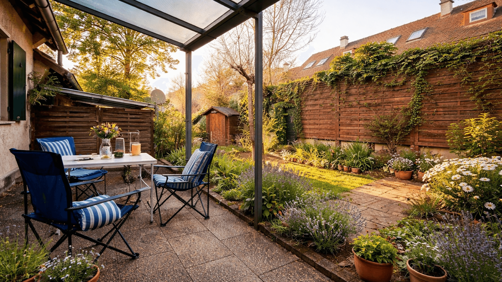 Das ca. 100 m² große Grundstück bietet trotz kompakter Größe eine angenehme Außenfläche. Der überdachte Freisitz mit ca. 13,2 m² lädt dazu ein, entspannte Stunden im Freien zu verbringen - geschützt und gemütlich zugleich.