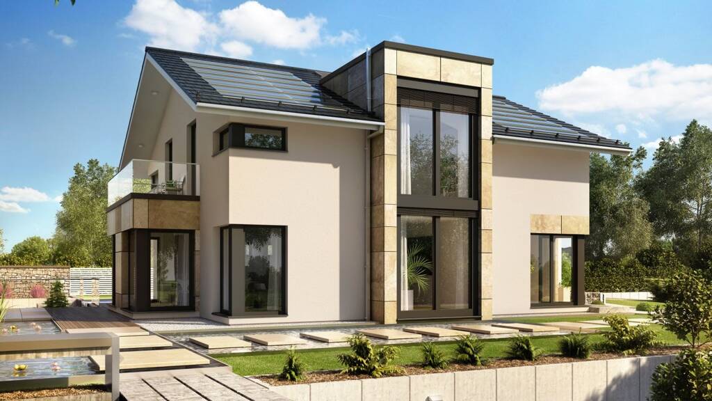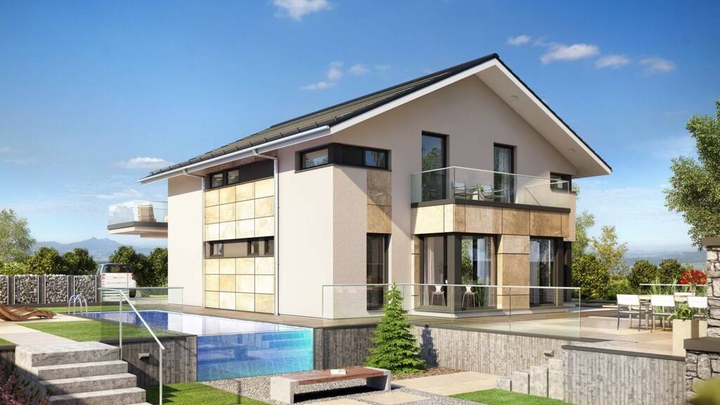 Wie vielfältig und frisch die moderne Landhausarchitektur sein kann, beweist diese Immobilie. Mit seinem flach geneigten Satteldach und den weiten Dachüberständen zeigt es deutliche Anlehnungen an den traditionellen regionaltypischen Baustil. Eine rustikale Holzverkleidung sucht man jedoch vergebens. Stattdessen zieren elegante Fassadenplatten in einem warmen, freundlichen Beigeton das Einfamilienhaus.
