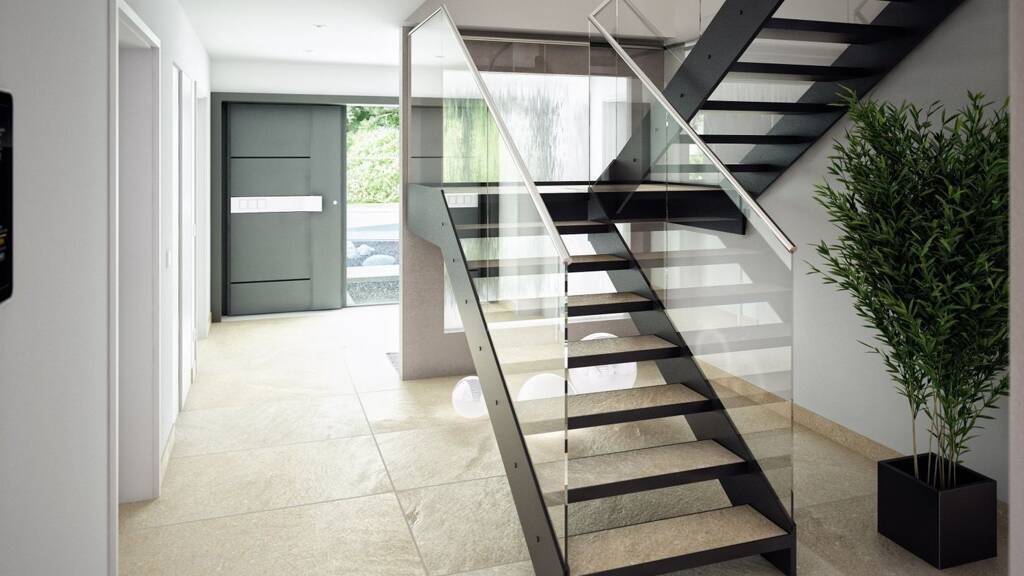 Schöne Akzente setzen die dunklen Fensterrahmen und die grau abgesetzten Fassadenflächen zwischen den schlanken Lichtbändern. Sie verleihen dem Fertighaus einen sehr edlen Charakter. An den schlichten, quadratischen Baukörper schließen sich ein großzügig verglaster Rechteck-Erker sowie ein Design-Querhaus mit Flachdach an, die die Wohnfläche um sonnige Lieblingsplätze erweitern. Absolutes Highlight ist der sonnenverwöhnte Terrassenbalkon, der über dem Eingangsbereich zu schweben scheint. Die Glasbrüstung verleiht ihm einen sehr leichten Charakter.