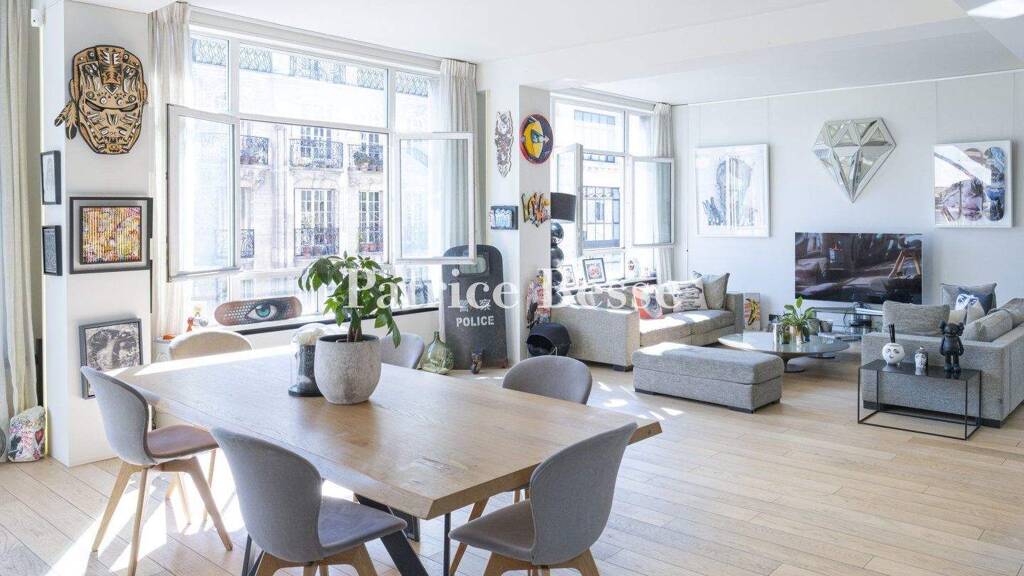 A modern apartment on the 4th floor of an Art Deco building, In between the Marais, Saint-Merri and Beaubourg districts. The building was originally built in the 1930s for office space but the use of its top three floors changed approximately ten years ago. The Art Deco façade is typical of the early 20th century, thanks to its symmetry, large windows and geometrical patterns. The property is on the fourth level, where a bow-window interrupts the uniformity of the façade as well as enlarging the interior. The main entrance is situated on the right of the building. It stands out thanks to its large, double-leaf glazed door and its period ironwork. The apartment is the only one on its level and can be reached by a large staircase and spacious elevator. The entrance door opens directly into a large, 60-m² living room. One of its sides is entirely occupied by windows which contribute, along with the light-coloured oak flooring, to the place's brightness. A fitted kitchen with natural wood fittings matching the flooring opens out onto the living room. Two bedrooms, each with a walk-in wardrobe and en suite shower room with lavatory, open into the lounge separated by a frosted glass sliding door system, which makes it possible to obtain a feeling of increased volume or close the bedrooms for privacy. The 16-m² master bedroom stands at one end of the apartment. It has a walk-in wardrobe and a large, almost 12-m² bathroom with a lavatory. Heating is provided by a reversible heat exchange pump, which provides air conditioning in the summer.
