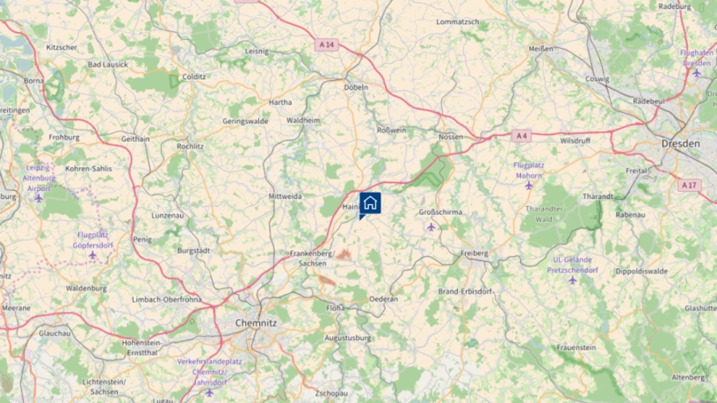 Der Bahnhof ist in ca. 10 min. fußläufig zu erreichen. Von hier aus gelangt man mit der City-Bahn in regelmäßigen Abständen, mit einer Fahrzeit von ca. einer halben Stunde, zum Hauptbahnhof Chemnitz. Die Autobahnanschlussstelle Hainichen erreichen Sie in ca.7 Fahrminuten.