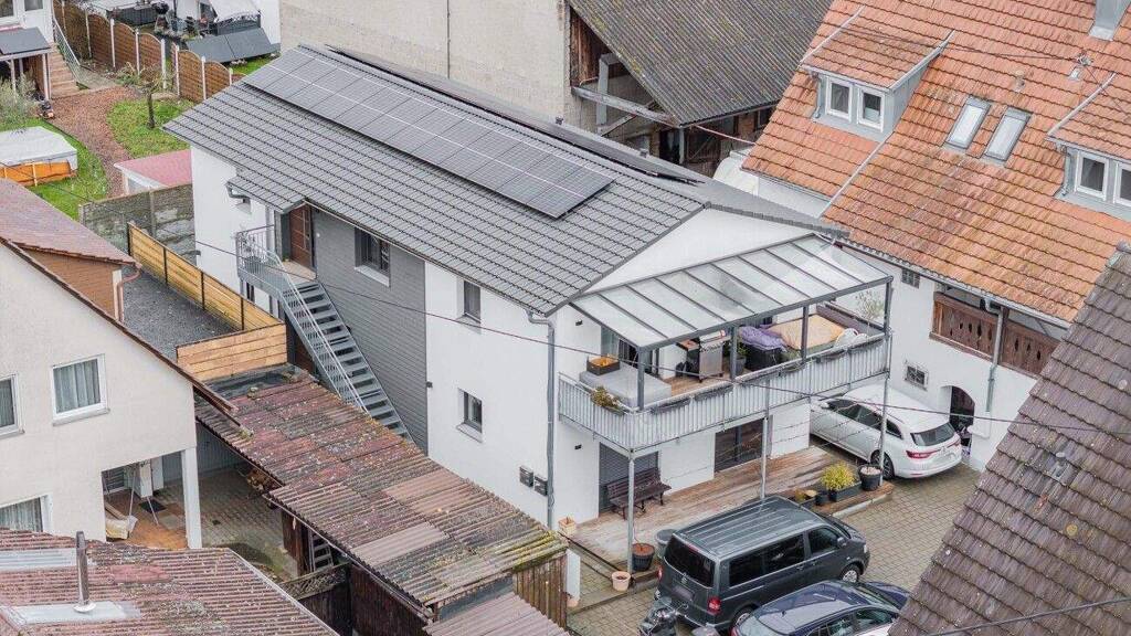 Das Bestandsgebäude im vorderen Grundstücksbereich stellt die wirtschaftliche Basis der Gesamtliegenschaft dar. Es umfasst zwei großzügige, familiengerechte Wohnungen und ist vollständig vermietet. Die aktuelle Jahreskaltmiete beläuft sich auf 28.440 Euro. Technisch wurde der Altbau in den vergangenen Jahren umfassend modernisiert. Die Heizungsanlage wurde 2023 vollständig erneuert und als intelligentes Hybridsystem ausgeführt, das bedarfs- und kostenoptimiert zwischen Wärmepumpe, Photovoltaik, Pelletheizung steuert. In diesem Zuge wurde zusätzlich eine Photovoltaikanlage installiert. Insgesamt wurde hierfür ein Investitionsvolumen im mittleren fünfstelligen Bereich umgesetzt, wodurch der Altbau heute über einen außergewöhnlich zeitgemäßen technischen Standard verfügt.