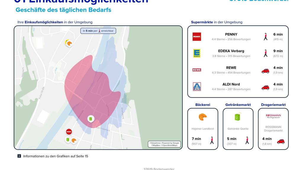 Einen Auszug aus unserem Lageexposee zu den Themen Einkaufsmöglichkeiten, Mobilität und Bildung finden Sie bei den Bildern.