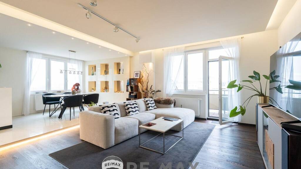 Bereits beim Betreten der Wohnung spürt man die besondere Atmosphäre: Großzügige Fensterfronten lassen den Wohnraum mit Licht durchfluten, während dezente indirekte Beleuchtung für eine stilvolle Abendstimmung sorgt. Die hochwertig ausgestattete Wohnküche bildet das Herzstück des offenen Wohnkonzepts - ideal für gesellige Abende oder entspannte Stunden mit Blick auf die Stadt. Zwei sonnige Balkone bieten zusätzlich wertvollen Freiraum im Freien - mit Blick Richtung Donaukanal, Urania und mehr.