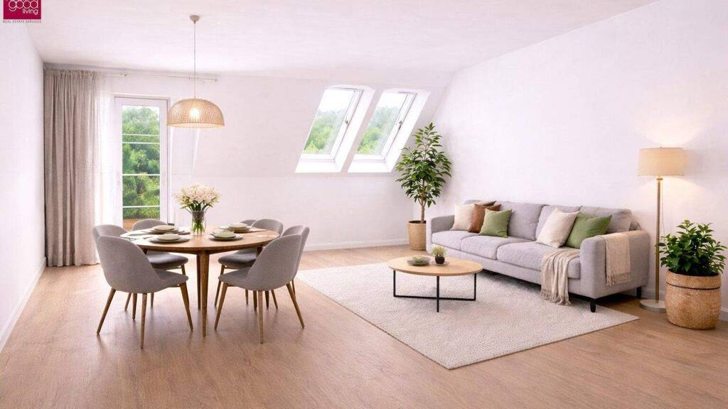 Der offen gestaltete Wohn- und Essbereich bildet das Herzstück der Wohnung und bietet direkten Zugang zum Balkon - ideal für entspannte Stunden im Freien. Zusätzlich sorgen schöne Dachfenster im Wohnbereich für viel natürliches Licht und eine besonders helle und freundliche Atmosphäre.