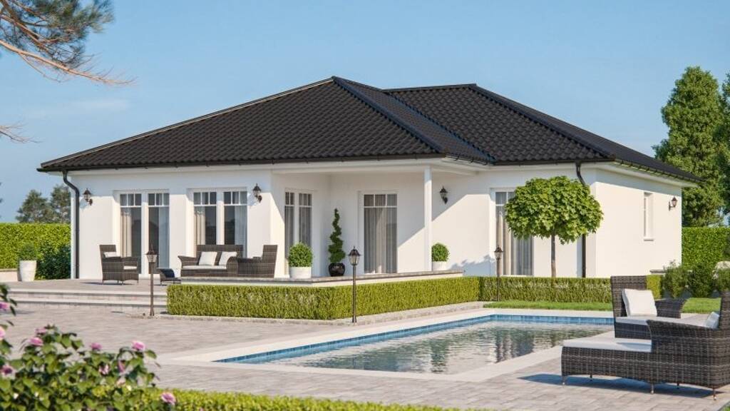 Willkommen Zuhause! Freuen Sie sich mit dem Entwurf "CLOU 126" auf einen zeitgemäßen Winkelbungalow. Alles ist ebenerdig zu erreichen und der Terrassenbereich ist überdacht. Das ist sehr praktisch bei jeder Wetterlage. In dieser Bauvariante sind die Wohnräume und die offene Küche zur Terrassenseite hin ausgerichtet und schaffen eine direkte Verbindung zum "Outdoor-Wohnzimmer". Der moderne Look des Ensembles erinnert an Ferien im Su?den.