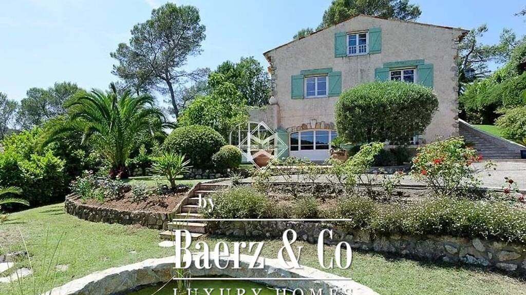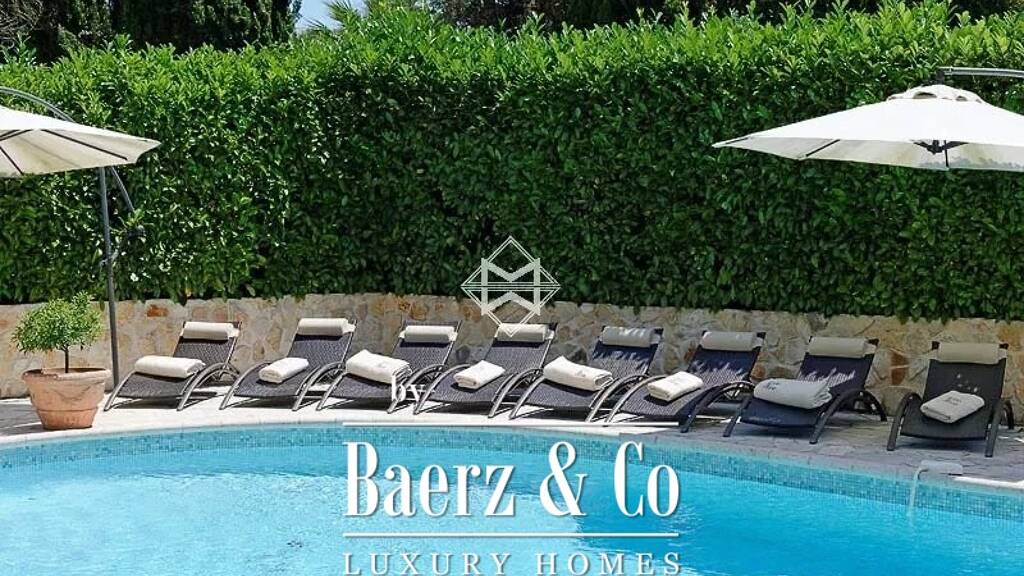 set in a garden of almost 2000m² planted with mediterranean essences, it offers 5 en suite bedrooms and an office, as well as superb living rooms with beautiful wooden beams, all opening onto the a terrace. the large family kitchen enjoy its own terrace and bbq area.