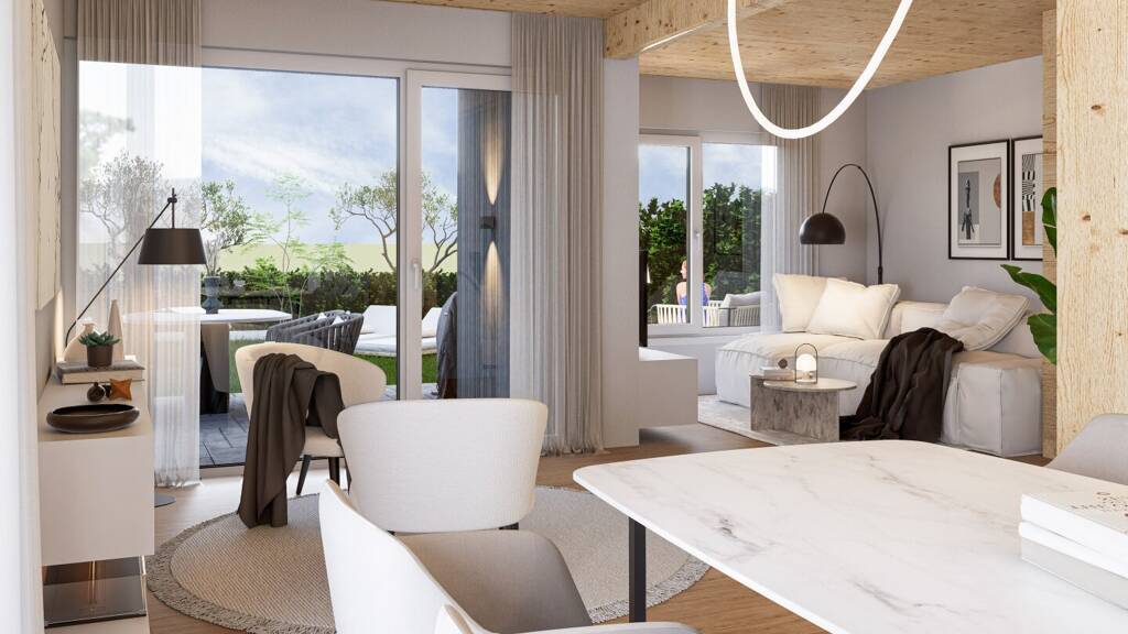 Beim Betreten der Haushälfte empfängt Sie ein großzügiger Vorraum für Garderobe und Stauraum. Weiter gehts zum Herzstück: Dem großen Wohn- & Esszimmer, dank Südausrichtung und großen Fensterflächen sehr hell. Hier finden eine Küche mit angrenzender Speis, ein großer Esstisch und eine gemütliche Wohnarea ihren Platz. Ein Gäste-WC ergänzt das Raumangebot im Erdgeschoss. Ein stilvolles Detail, welches sich durchs ganze Haus zieht: Echtholzwand im Essbereich und eine edle Massivholzdecke. Vom Wohnbereich führt eine Treppe hinunter in den Keller und hinauf in die private Etage.