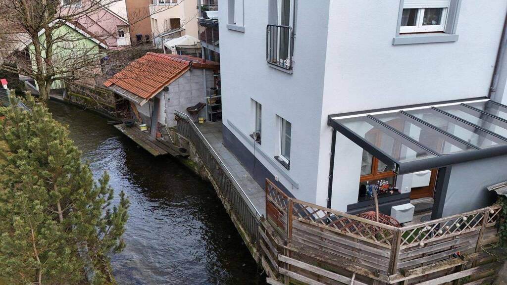 Vom Wohnbereich aus gelangen Sie direkt auf die Terrasse mit überdachtem Freisitz - ein besonderer Rückzugsort, der zum Entspannen und Verweilen einlädt. Direkt unterhalb der Terrasse verläuft ein Bach, dessen sanftes Plätschern eine ganz eigene, beruhigende Atmosphäre schafft und dem Außenbereich einen unverwechselbaren Charakter verleiht.
