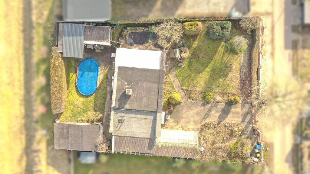Das Grundstück bietet gleichzeitig gute Entwicklungsmöglichkeiten. Vorhanden sind unter anderem ein Pool, ein Carport, eine überdachte Terrasse sowie ein älterer Teich. Die Außenanlagen befinden sich ebenfalls in einem Zustand, der je nach Anspruch überarbeitet, neu geordnet oder teilweise zurückgebaut werden sollte. Damit bietet das Grundstück Spielraum für eine individuelle Neugestaltung.