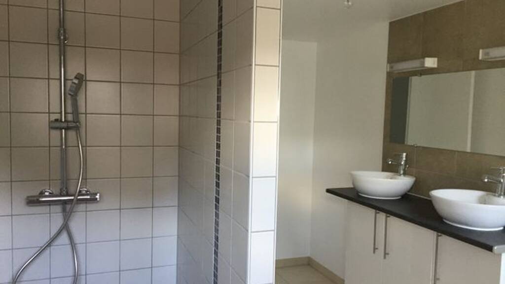 Modernes Badezimmer mit Doppelwaschbecken & begehbarer Dusche