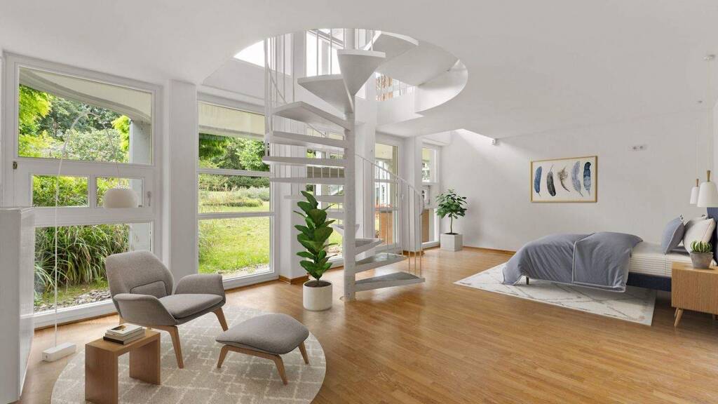 Eine Wendeltreppe führt Sie in das Untergeschoss der Wohnung: Hier befindet sich ein weiteres Schlafzimmer oder ein perfekt geeigneter Homeoffice-Bereich mit Blick ins Grüne & Zugang zur Terrasse und in den gepflegten Gemeinschaftsgarten.