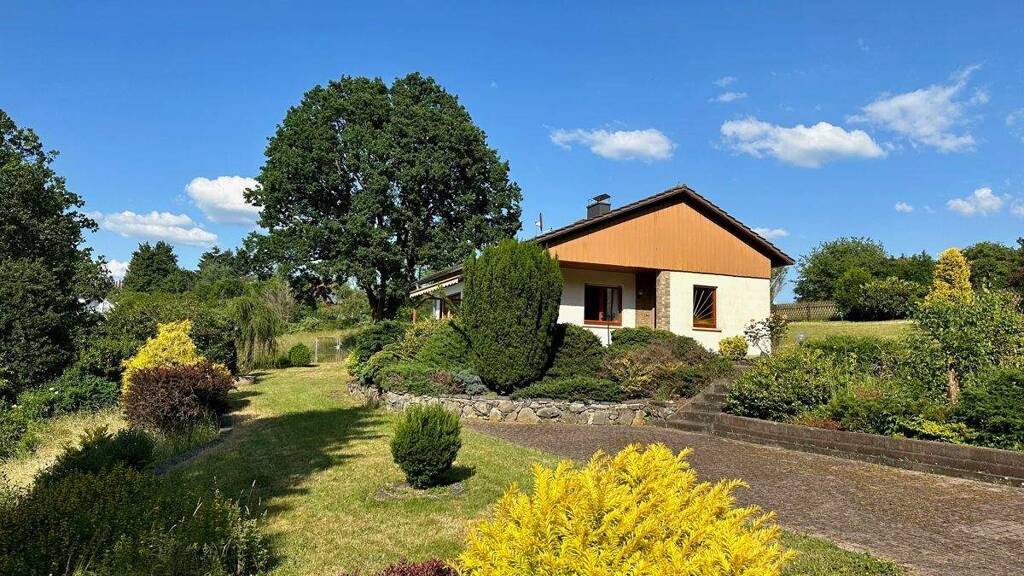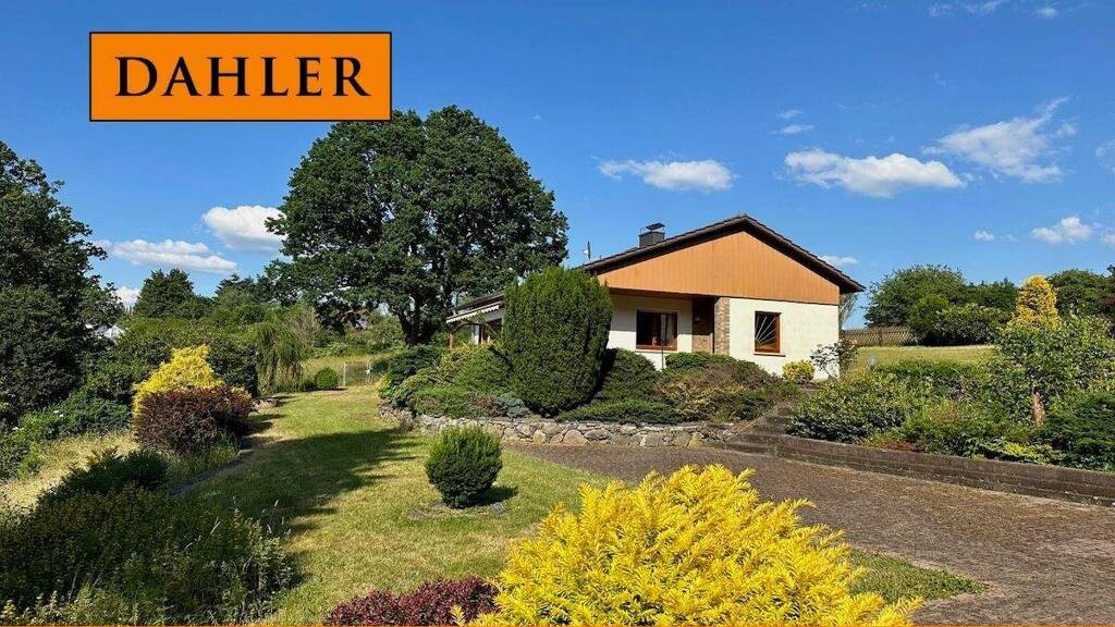 * Das außergewöhnliche Anwesen ist für Ruhesuchende und Genießer einer schönen Aussicht ein seltenes Juwel in der heutigen Zeit. * Das Grundstück hat Hanglage und kann mit fast 3.000 Quadratmetern aufwarten. * Aus dem ehemaligen Wochenendgebiet ist ein Wohngebiet mit Bebauungsplan geworden. Auf dem Anwesen befindet sich derzeit ein Haus aus dem Jahr 1967 welches von ca. 75 m² auf ca. 200 m² Wohnfläche vergrößert werden kann. * Aktuell stehen ca. 75 qm Wohnfläche zur Verfügung, die sich auf ein Schlafzimmer, ein kleines Tageslichtbad mit Dusche, einem hellen und freundlichen Wohn-/Essbereich mit Specksteinofen, einer kleinen Küche und einem weiteren Souterrain Zimmer im Kellergeschoss verteilen. * Das Kellergeschoss hat eine ansprechende Deckenhöhe und bietet so weiteres Ausbaupotential. * Am Eingang des Grundstückes befindet sich eine großzügige Doppelgarage und eine großzügig gepflasterte Hofeinfahrt bis zum Haus * Glasfaserkabel führt am Grundstück vorbei und könnte an das Haus angeschlossen werden. Effizientes Arbeiten im Homeoffice wäre so gegeben. * Ein Wirtschaftsweg führt zu dem komplett eingezäunten Grundstück, das für Hundeliebhaber einen sicheren Auslaufsschutz bietet.