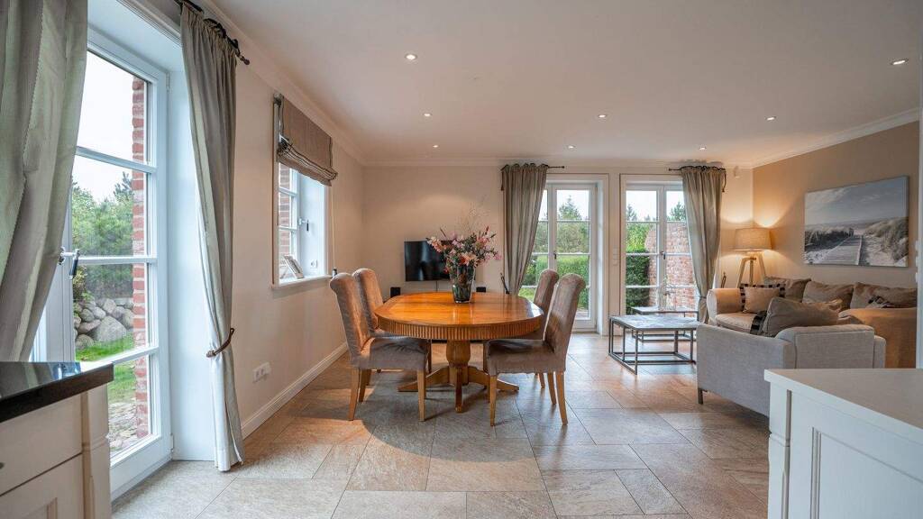 Diese außergewöhnlich charmante Doppelhaushälfte unter Reet aus dem Baujahr 2012 vereint auf eindrucksvolle Weise zeitlose Eleganz mit moderner Wohnqualität. Auf rund 90 Quadratmetern Wohnfläche, verteilt über drei Ebenen mit Erdgeschoss, Obergeschoss und ausgebautem Spitzboden in Wohnraumqualität, entfaltet sich ein stilvolles Zuhause mit ganz besonderem Charakter. Die Außenfassade aus antikem Verblendermauerwerk verleiht dem Haus bereits auf den ersten Blick eine unverwechselbare nordische Ausstrahlung. Durch eine wunderschöne Eingangstür gelangt man in den einladenden Eingangsbereich, von dem aus zur einen Seite ein ebenerdiges Badezimmer und zur anderen Seite ein Hauswirtschaftsraum erreichbar sind. Der Mittelpunkt des Hauses ist der großzügige Wohn- und Essbereich mit integrierter Küche, der eine warme und zugleich elegante Atmosphäre ausstrahlt. Ein antiker Kachelofen der Firma Mylin sorgt an kühleren Tagen für ein behagliches Wohngefühl. Die Küche ist mit einer edlen schwarzen Granitplatte, originalen Delfter Fliesen als Fliesenspiegel, einem großen Gasherd der Marke La Cornue sowie hochwertigen Einbaugeräten von Gaggenau ausgestattet. Hier verbinden sich Stil und Funktionalität auf harmonische Weise. Die Badezimmer im Erdgeschoss und im Obergeschoss sind mit Limestonefliesen ausgelegt, was dem Raum eine schlichte Eleganz verleiht. Im Obergeschoss erwartet Sie ein großzügig gestaltetes Bad mit einer Regendusche, einer freistehenden Badewanne von Philippe Starck sowie einem Waschtisch und Bodenbelag aus hochwertigem Limestone. Das ebenfalls im Obergeschoss gelegene Schlafzimmer ist großzügig geschnitten und mit maßgefertigten Einbauschränken ausgestattet. Ein weiteres kleineres Zimmer kann ideal als begehbarer Kleiderschrank oder praktischer Abstellraum genutzt werden. Der ausgebaute Spitzboden bietet zusätzlichen Raum. Der Außenbereich rundet das Gesamtbild perfekt ab. Eine liebevoll gestaltete Terrasse mit Gartenanteil lädt dazu ein, die frische Nordseeluft zu genießen und den Alltag hinter sich zu lassen. Ein eigener Parkplatz direkt vor dem Haus sorgt für zusätzlichen Komfort. Für Sicherheit ist dank einer Alarmanlage gesorgt. Die Lage unweit der Böhler Strandüberfahrt macht dieses Haus zu einem Rückzugsort, an dem sich das Gefühl von Urlaub vom ersten Moment an einstellt. Diese exklusive Reetdach-Doppelhaushälfte vereint norddeutsche Baukunst mit einem hochwertigen und zugleich gemütlichen Wohnambiente. Sie bietet die ideale Umgebung für Menschen, die das Besondere suchen und Wert auf Qualität, Stil und Lage legen. Vereinbaren Sie gerne einen Besichtigungstermin und lassen Sie sich von diesem einzigartigen Zuhause persönlich begeistern.