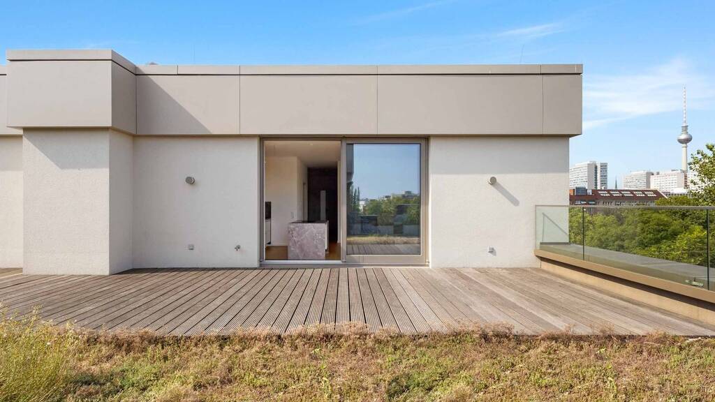 Außenbereiche: Die ca. 46m² große Dachterrasse ist das Herzstück dieses Penthouses. Dank der Ost-West-Ausrichtung genießen Sie hier den ganzen Tag Sonne – morgens beim Frühstück, mittags beim Entspannen und abends beim Sonnenuntergang. Der Blick schweift über das autofreie Quartier bis hin zum Berliner Fernsehturm - Berlins Wahrzeichen direkt vor Ihrem Fenster.