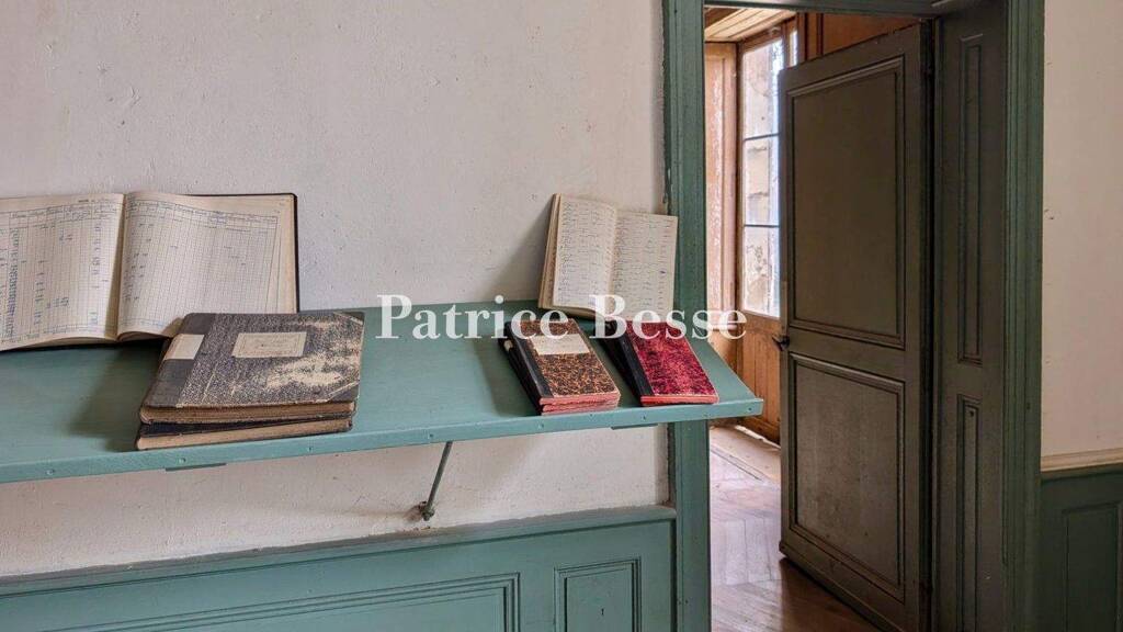 The entrance double door stands at the top of the front flight of steps. It has kept all its original iron fittings. It leads into a spacious hallway that runs all the way through the edifice to the garden at the back. From this hallway, two stone staircases with wrought-iron balusters rise up in symmetry to the first floor. On the left, a first door leads to a kitchen with original stone-slab flooring. It has a stone sink, wooden-panelled cupboards that take up an entire wall and an imposing stone fireplace. An adjoining scullery has wood strip flooring and a flight of wooden backstairs that leads upstairs. This scullery lies beside a dining room that faces the garden. The dining room's chevron parquet, clock and wooden wall panelling with an integrated fireplace create the old ambience of traditional family homes. On the garden side, there is a second room with wood strip flooring. It is bathed in natural light and has a stone fireplace. It leads to a bathroom with a lavatory beneath the flight of backstairs. To the right of the hallway, a first door leads to a pantry with stone-slab flooring. It has a stone sink beneath blue and white ceramic tiles, an imposing stone fireplace and a wall of painted wooden panelling that integrates cupboards. It connects to a flight of backstairs, a ...