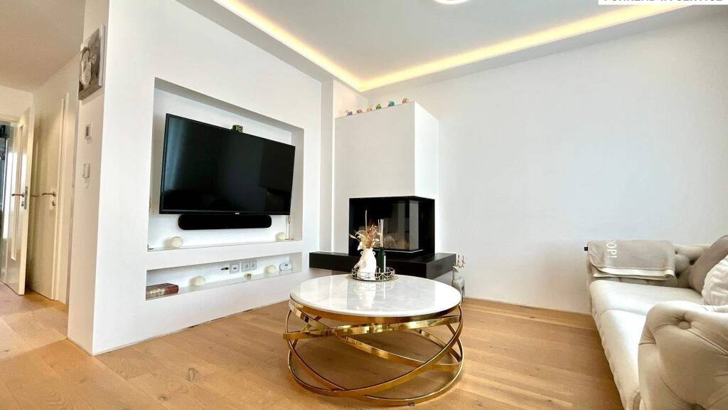 Ein besonderes Highlight ist der exklusive Markenkamin der deutschen Firma Brunner, der dem Wohnbereich eine elegante und zugleich gemütliche Atmosphäre verleiht.
