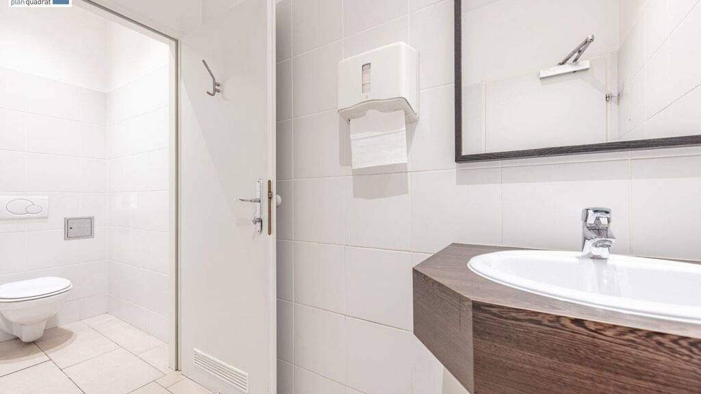 ein Badezimmer mit Dusche und Toilette (ideal, falls Sie und / oder Ihre Mitarbeiter, dem Trend der Zeit folgend, womöglich lieber mit dem Fahrrad ins Büro kommen, als morgens im Stau zu stehen)
