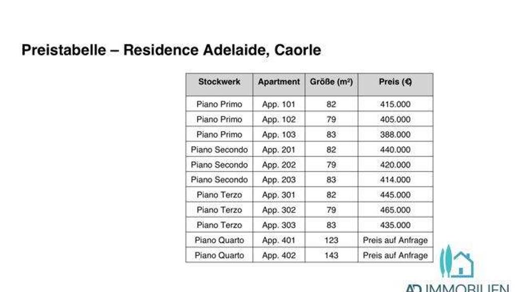 .Preisspanne: 388.000 - 465.000 € (je nach Stockwerk und Größe) .Attici (Dachwohnungen): Preise auf Anfrage .Auf alle Preise fällt zusätzlich 10 % IVA (Mehrwertsteuer) an, da es sich um Neubauten handelt .Stellplatz in der Tiefgarage ist im Preis enthalten .Die Verfügbarkeit kann sich ändern - bitte immer aktuelle Informationen anfragen