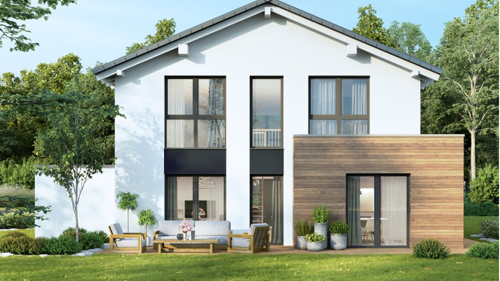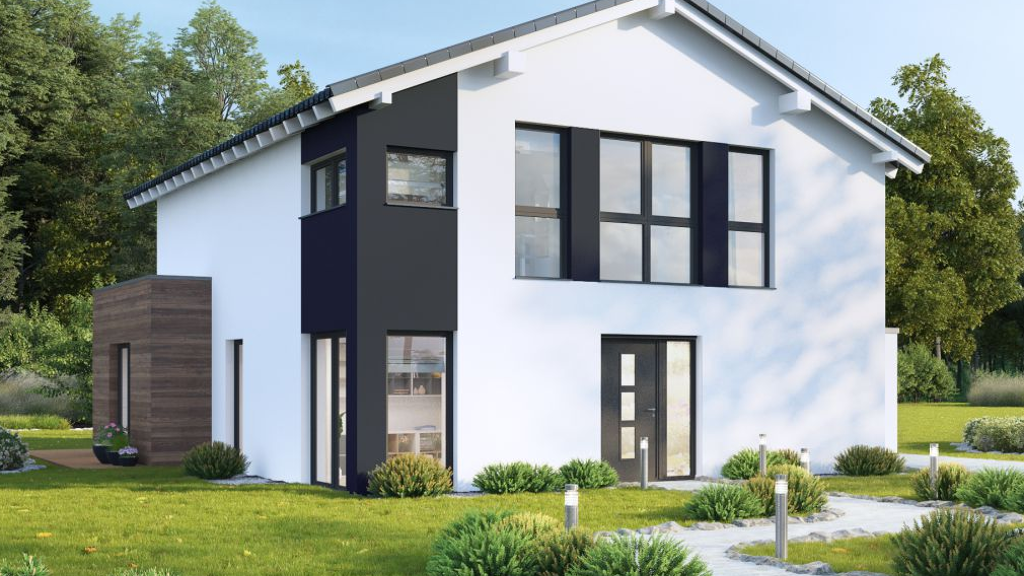 Das FAVORIT Massivhaus SL157 besticht durch seine moderne Architektur und die optimale Raumausnutzung. Über den Eingangsbereich, tritt man in eine große Diele, die gleichzeitig als Haupterschließungsachse des Gabäudes dient. Hierüber erreicht man die Garderobe und das Gäste-WC mit dem angegliederten Gästezimmer. Der Wohn- und Essbereich schließt sich an die offene Küche an und orientiert sich mit großen Fensterflächen zum Garten, der einen traumhaften Ausblick ins Grüne bietet. Das zusätzliche Büro bietet sich idealerweise auch zum Arbeiten im Homeoffice an. Im Bereich des Obergeschosses gelangt man über die Galerie neben den 2 Kinderzimmern auch in das Familienbad und das Elternschlafzimmer mit angeschlossenem Ankleidebereich. Die mittige Erschließungsachse, bietet über den zum Erdgschoss offenen Luftraum ebenfalls Ausblicke in den Garten und lässt zudem viel Licht in das Obergeschoss.