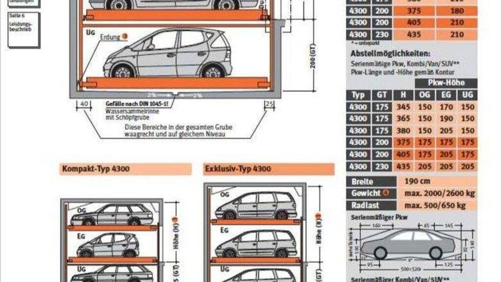 Der Parkplatz ist auch tauglich für SUVs bis zu 5 Meter Länge, 1,9 Meter Breite, 1,70 Meter Höhe und 2 Tonnen Gewicht.
