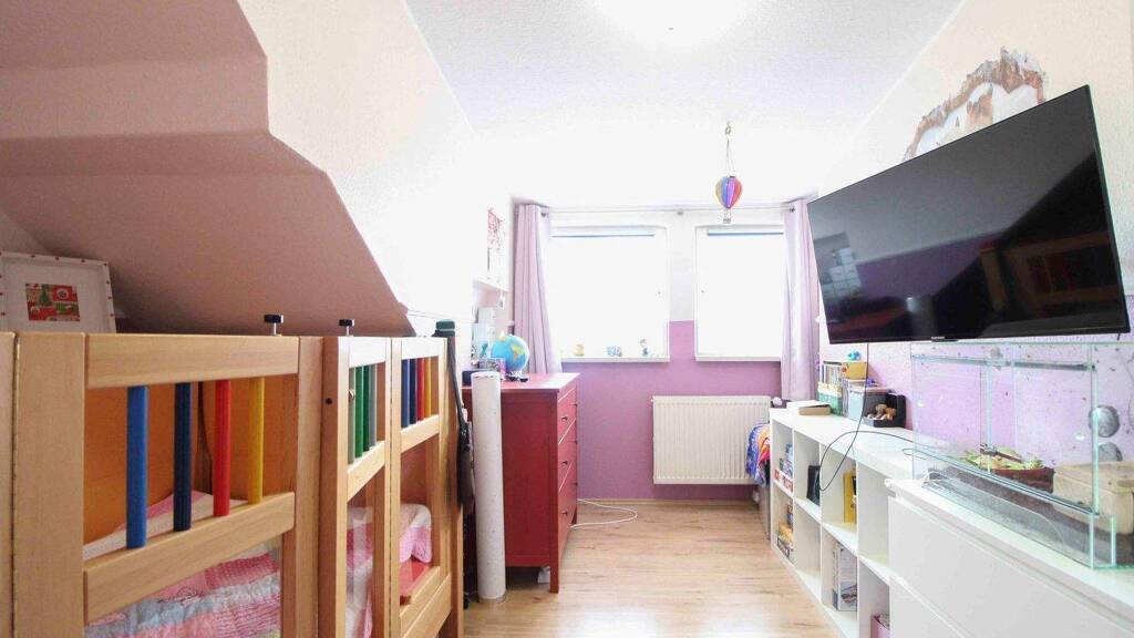 Auf rund 140 m² Wohnfläche verteilen sich 6 helle Zimmer, darunter drei Schlafzimmer, zwei moderne Bäder sowie ein großzügiger Eingangs- und Wohnbereich mit Kaminofen. In der Küche erwartet Sie eine moderne Einbauküche mit Kochinsel. Das Bad im Erdgeschoss ist mit einer Fußbodenheizung ausgestattet und wurde, wie das obere Bad, in den letzten zehn Jahren komplett erneuert.