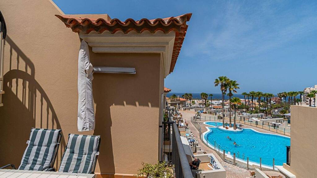 Terrazas del Faro ist eine begehrte Wohnanlage mit einem schönen beheizten Swimmingpool mit großer Sonnenterrasse und Meerblick, einem kleinen Supermarkt und einigen Bars und Restaurants und genießt eine sehr zentrale Lage im Dorf Palm-Mar, nur wenige Gehminuten von der Promenade entfernt.