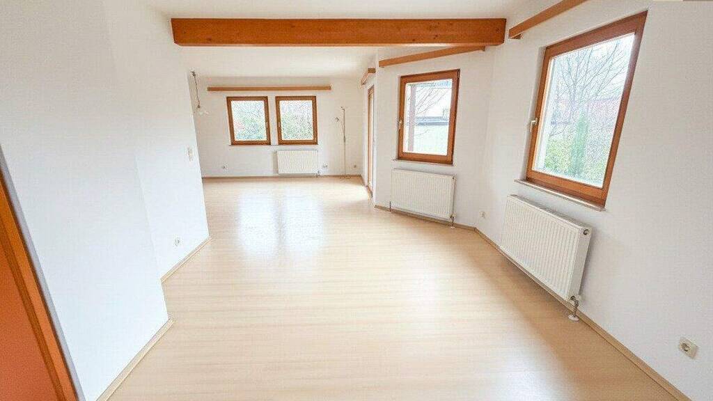 Das Herzstück des Hauses bildet der großzügige Wohnbereich. Großzügige Fensterflächen schaffen ein helles, freundliches Raumgefühl und öffnen den Blick ins Grüne. Von hier aus gelangen Sie sowohl in die separate Küche als auch auf die sonnige Terrasse mit angrenzendem Garten - ein klassisches Setting für Familienleben, gesellige Abende und entspannte Stunden im Freien.
