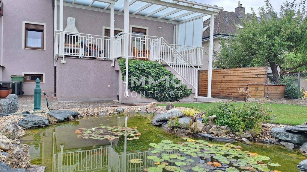 Das Grundstück umfasst ca. 385 m², davon rund 230 m² Gartenfläche mit einem idyllischen Teich - ein perfekter Rückzugsort für Naturliebhaber. Die nordseitige Terrasse lädt zu entspannten Stunden im Freien ein.