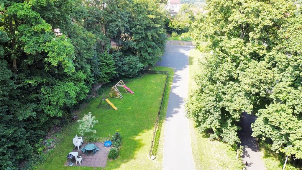 Flurstück 1054/1 - ca. 2.100 m² voll erschlossenes Bauland, derzeit genutzt mit 8 vermieteten Stellplätzen, einem eingezäunten Spielplatzbereich und Grünflächen.