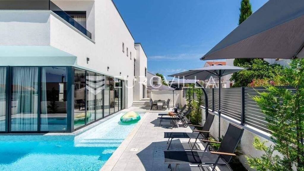 Predstavljamo vam ovu prekrasnu i potpuno opremljenu vilu s bazenom u malom mjestu pokraj Zadra, Vrsima koja je udaljena svega 150 metara od mora, uredene lokalne plaze te svih ostalih potrebnih sadrzaja kljucnih za kvalitetan zivot ili odmor.Vila je ukupne neto povrsine 160m2, dok njena bruto povrsina iznosi 261m2. Sastoji se od prizemlje, kata i prostrane krovne terase s jacuzzijem i ljetnom kuhinjom.Na prizemlju povrsine 92,40m2 se nalazi komforna kuhinja s blagavaonicom, dnevni boravak, kupaonica, hodnik te stubiste kojim dolazimo na 1. kat.Prvi kat povrsine 96,5m2 se sastoji od tri spavaca sobe s en suite kupaonicama, od kojih je jedna master spavaca soba, te hodnika i balkona povrsine 13,9m2.Prekrasna krova terasa povrsine 72,80m2 je opremljena jacuzzijem i ljetnom kuhinjom, a s nje se pruza pogled na more koji ce vas ocarati.Uz to, u dvoristu vile se nalazi i bazen povrsine 53m2, garaza i spremiste od 32m2, te vanjski parking, ljetna kuhinja i rostilj.Vrsi Mulo je slikovito naselje smjesteno na sjeverozapadnom dijelu Dalmacije, nedaleko od grada Nina. Poznato je po prekrasnim plazama s kristalno cistim morem i mirnom atmosferom koja privlaci mnoge turiste. Mjesto zadrzava sarm tradicionalnog dalmatinskog sela, s uskim ulicama i kamenim kucama. U blizini se nalaze brojne prirodne i kulturne znamenitosti, poput Velebita i povijesnog grada Zadra.Dodatne informacije - udaljenost od vaznijih lokacija:More: 150m / Plaza: 150m / Mjesto za brod: 300mKupovina: 300m / Ugostiteljski objekti: 250m / Ljekarna 800mZadar: 22km / Zracna luka: 33km / Autocesta: 23kmZa vise informacija te dogovor o razgledavanju, budite nas slobodni kontaktirati... Vise na eurovilla.hr, ID: 646781