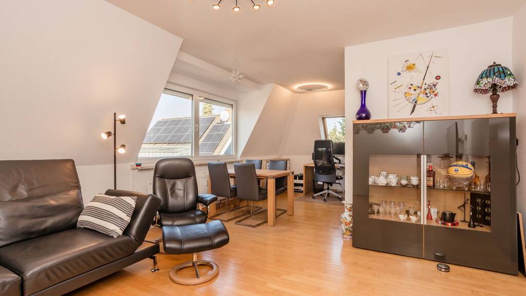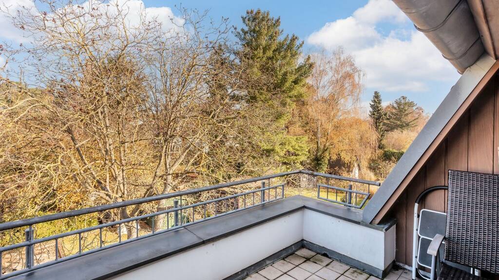 This bright 2-room attic apartment in a well-kept townhouse from 1995 offers approx. 53.95 m² of living space and boasts a clearly structured floor plan. The living area with open kitchen has a friendly design and leads directly onto the north-facing roof terrace, which offers a peaceful view of the communal garden.