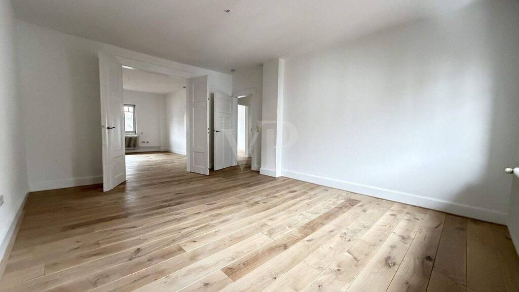 Der vollständig renovierte Zustand zeigt sich in sämtlichen Details. Hochwertiger Holzdielenboden verleiht den Räumen eine warme und elegante Atmosphäre, während typische Altbauelemente wie beispielsweise die repräsentativen Flügeltüren, den historischen Charakter des Hauses stilvoll widerspiegeln. Die Kombination aus moderner Ausstattung und klassischer Architektur schafft ein Wohngefühl, das gleichermaßen repräsentativ wie behaglich wirkt.