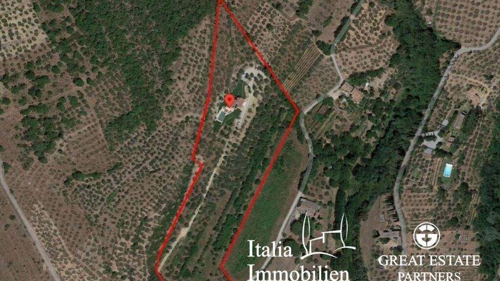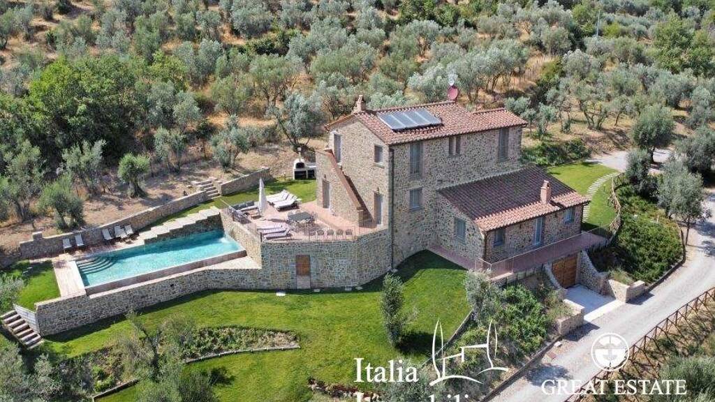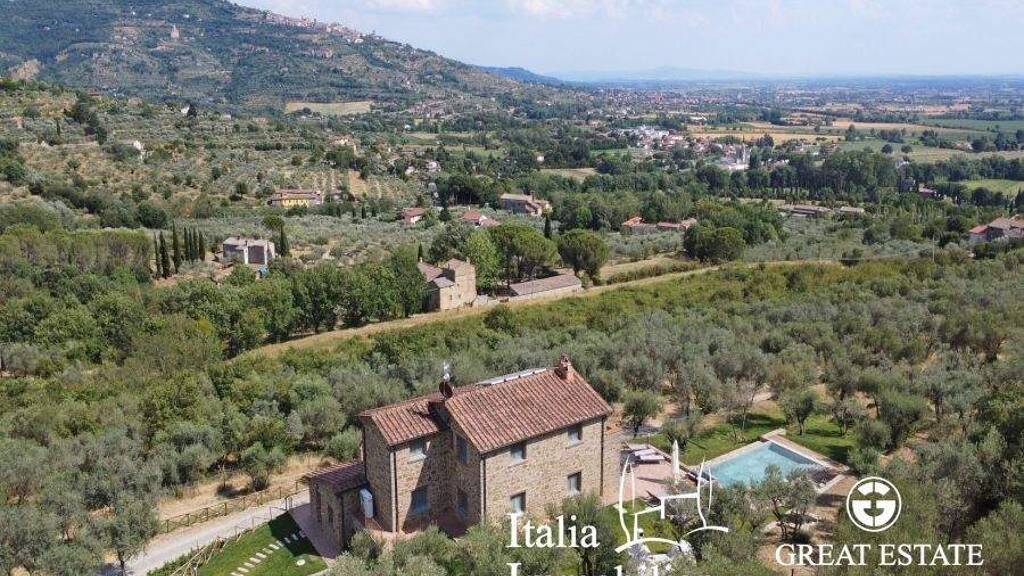 In der Nähe des berühmten Ortes Cortona befindet sich dieses herrliche Bauernhaus aus Stein mit einer Fläche von 262 m², die auf 4 Ebenen verteilt ist, welche sowohl von außen als auch von innen zugänglich sind und sich wie folgt zusammensetzen: Im Untergeschoss befinden sich eine große Garage und ein Technikraum. Im Erdgeschoss gibt es einen hellen, offenen Raum mit Küche, Essbereich und Wohnbereich. Der erste Stock besteht aus 2 großen Schlafzimmern mit eigenem Bad und ein helles Wohnzimmer mit Bad und externen Zugang. Im zweiten Stock liegen 3 Schlafzimmer mit eigenem Bad und eine romantische Loggia mit Poolblick, die zur Außentreppe führt. Besonderes Augenmerk wurde auf die Raumaufteilung, Licht, Farbe und Materialien gelegt. Das Anwesen ist von 2,6 Hektar Land umgeben, von denen 1.095 Quadratmeter als Garten genutzt werden, während die restlichen 2,5 Hektar als Olivenhain dienen. Abgerundet wird dieses herrliche Anwesen durch einen exklusiven Swimmingpool aus Travertin mit Wasserfall, von dem aus man die wunderschöne Landschaft von Cortona überblicken kann.