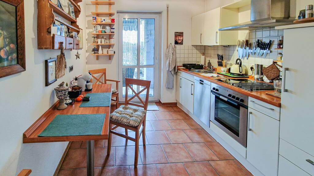 Die separate Küche ist mit einer funktionalen Einbauküche ausgestattet. Neben dem Wohnzimmer stehen ein Schlafzimmer und ein weiteres, vielseitig nutzbares Zimmer (z.?B. Büro oder Gästezimmer) zur Verfügung. Ein Badezimmer mit Badewanne, ein separates WC sowie ein Abstellraum ergänzen das Raumangebot.
