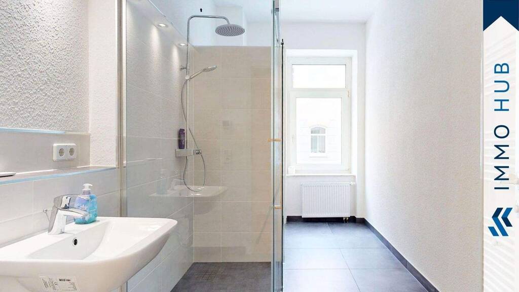 Das Badezimmer wurde hochwertig und vollständig saniert. Die ebenerdige Dusche, das Fenster sowie die modernen Sanitärobjekte unterstreichen den zeitgemäßen und eleganten Charakter dieses Raumes.
