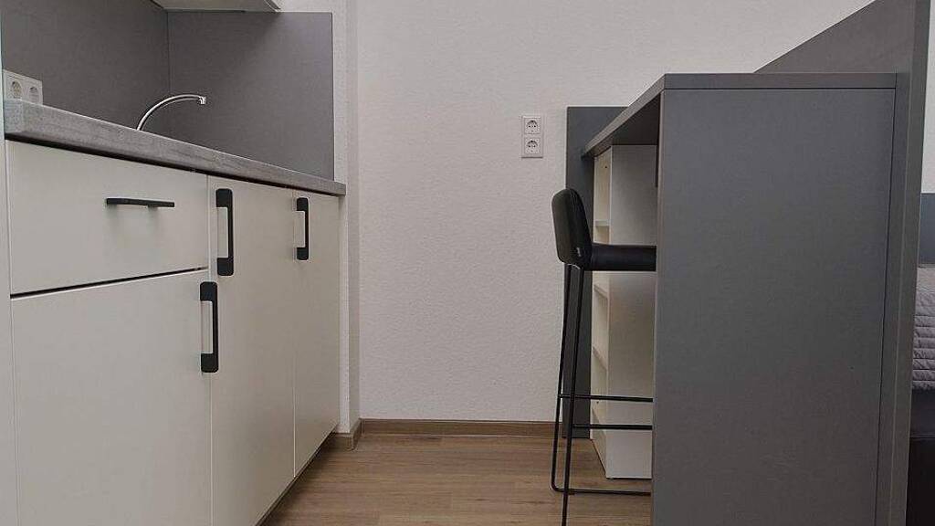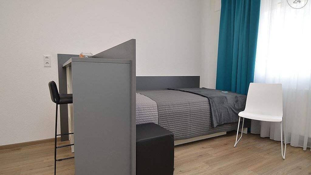 Das ca. 21m² große Apartment liegt im 1.Obergeschoss eines großen Wohnkomplexes und ist mit Design-PVC-Boden ausgelegt. Der Wohnraum ist mit einer Single-Küche, welche mit einem Kühlschrank mit Tiefkühlfach, einer Mikrowelle mit Grillfunktion und zwei Cerankochfeldern ausgestattet ist, einem Essplatz, einem Schreibtisch, einem Einzelbett mit Nachttisch sowie mit einem Kleiderschrank mit weiteren integrierten Stauraummöglichkeiten und einem TV möbliert. Das Badezimmer ist mit einer großzügigen ebenerdigen Dusche und einem WC ausgestattet.