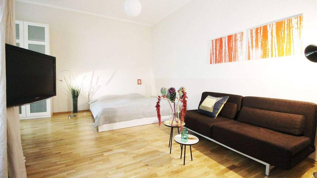 Zwei im Hochparterre gelegene Einzimmerwohnungen. Diese wurden bisher als 2 getrennte Einheiten möbliert vermietet, könnten aber auch wieder zu einer Einheit zusammengeführt werden. Die größere Einheit hat 42,5qm und verfügt über einen Balkon und ein Bad mit Wanne, die kleinere ist 35,74qm groß und hat ein Bad mit Dusche.