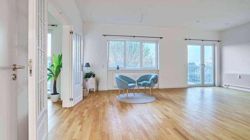 Der großzügige Wohn- und Essbereich bildet das Herzstück der Wohnung und kann je nach Bedarf offen gestaltet oder durch elegante Flügeltüren abgetrennt werden. Edles Eichenparkett und bodentiefe Fenster sorgen in allen Räumen für eine helle, moderne Wohnatmosphäre.