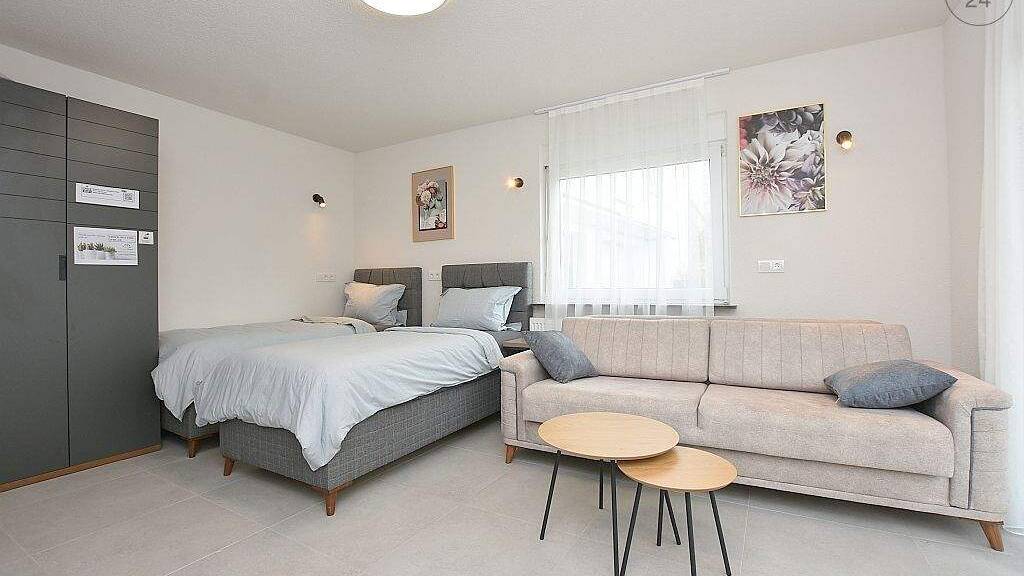 AUFTEILUNG: - Wohn- und Essbereich mit großer Fensterfront und Zugang zum Balkon, möbliert mit Schlafsofa, zwei Einzelbetten, Kleiderschrank, zwei kleinen Tischen mit zwei Stühlen und Smart-TV - voll ausgestattete, separate Einbauküche mit Geschirrspüler, Backofen und Mikrowelle - Badezimmer mit Dusche