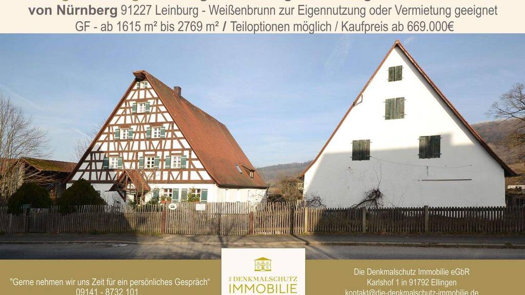 Ausstattung: - Baudenkmal (Wohnhaus, Scheune und Nebengebäude) - Der Garagenanbau ist kein Baudenkmal - Erhöhte steuerliche Abschreibung, Denkmal-AfA (Absprache mit dem BLfD nötig) - Zuschüsse und Förderungen möglich (Absprache mit dem BLfD nötig) - KfW Denkmalschutz Förderprogramme (Absprache nötig) - Kachelofen im Esszimmer, im Wohnzimmer besteht die Möglichkeit einen Kachelofen anzuschließen - Öl-Heizung - Fliesen bzw. Holzböden - Kreuzgewölbe im Wohnzimmer (ehem. Kuhstall) - Fenster vom Schreiner gebaut - Küche mit großer Speiß - 3 Badezimmer - Kleiner Keller, perfekt als Weinkeller - Laut Flächennutzungsplan sind die Grundstücke als „Mischgebiet“ eingetragen - 3 Garagen Besonderheiten: Die Immobilie ist derzeit vermietet. Das bestehende Mietverhältnis kann auf Wunsch übernommen, oder mit einer Frist von 9 Monaten (laut Aussage des Eigentümers) gekündigt werden. Mietzins 1834 €/Monat (1734 € Nettomiete / 100 € Betriebskostenpauschale) Laut Auskunft der Gemeinde Leinburg ist eine zusätzliche Bebauung möglich. Die Bebauung richtet sich nach § 34 BauGB. Auf die Denkmalseigenschaft der bestehenden Gebäude ist zu achten. Abweichend von den aktuellen Flächen und Grenzen der beiden Flurstücke, besteht die Möglichkeit einer individuellen Anpassung der Grundstücksgrenzen und -flächen der beiden Flur-Nummern 9 und 11 an den Bedarf des bzw. der Käufer der beiden Grundstücke. Im Exposé sehen Sie einen beispielhaften Vorschlag, der eine separate Zufahrt und Bebauungsmöglichkeit des Grundstückes Flur Nr. 11 unabhängig von der Fläche der Flur Nr. 9 ermöglichen würde. Durch die veränderten Grundstückflächen ergeben sich neu zu berechnende Kaufpreise für die beiden Objekte.