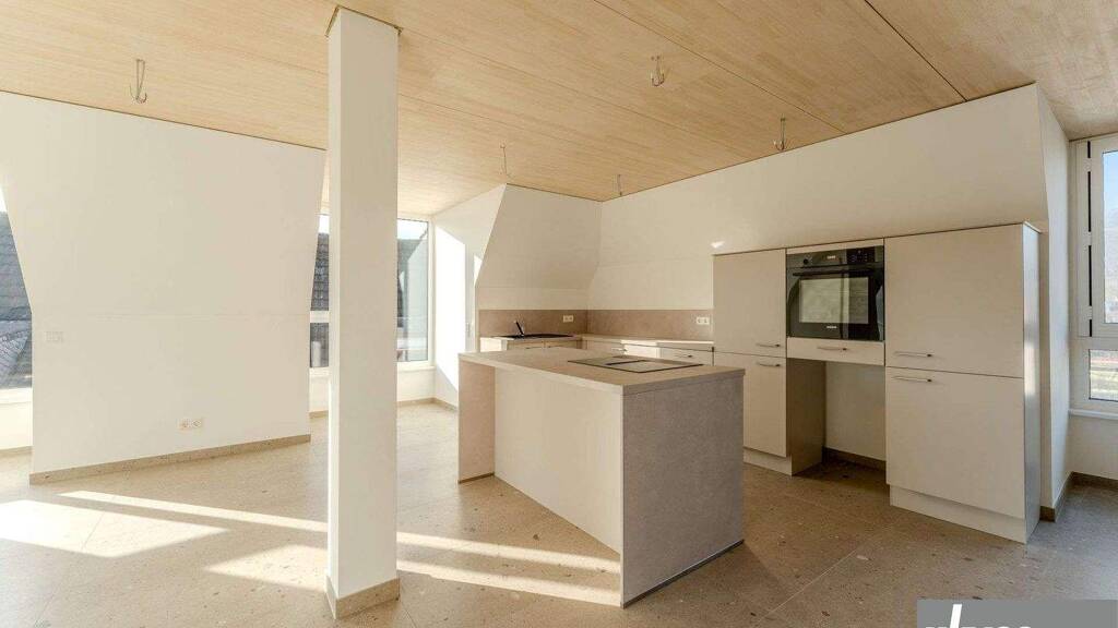 Das großzügig gestaltete Wohnzimmer überzeugt durch seine moderne, offene Bauweise und führt direkt zur stilvollen Kücheninsel - perfekt für kulinarische Abende im angrenzenden Essbereich. Von hier aus gelangen Sie auf die große Dachterrasse, die zum sonnigen Entspannen einlädt.