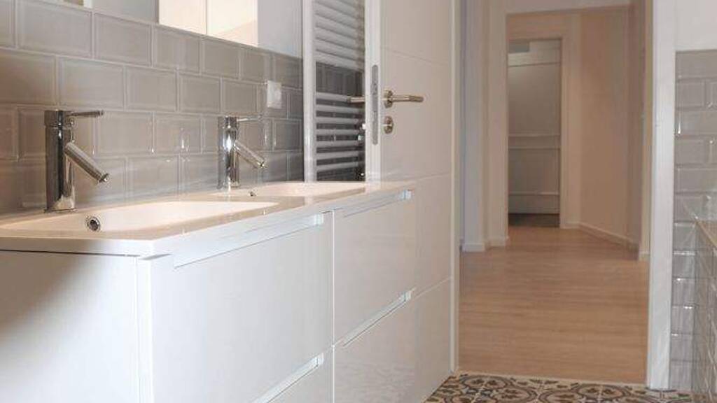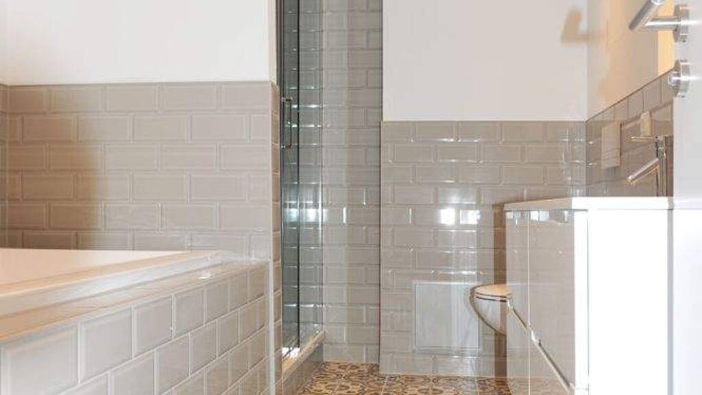Das Badezimmer wurde von unserer Architektin elegant und stilvoll mit Ornamentfliesen im Bodenbereich und Metrofliesen an den Wänden gestaltet. Einbaustrahler und Doppel-Designerwaschtisch und eine besonders große Dusche unterstreichen den luxuriösen Charakter der Wohnung.