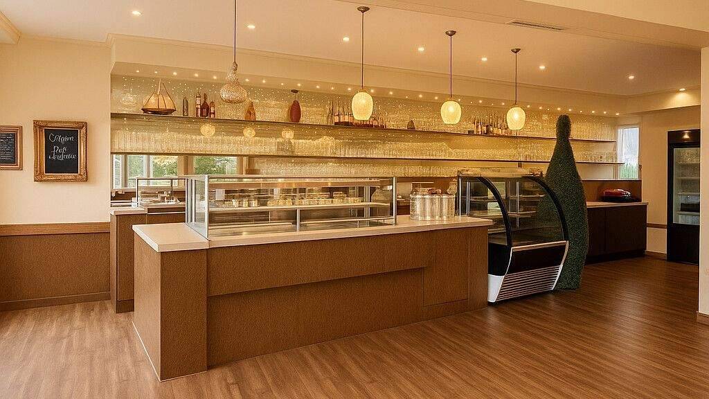 Die große und vielseitig nutzbare Theke legt den Grundstein für kreative Verkaufskonzepte - sei es Eis, Kuchen oder andere köstliche Angebote -, kombiniert mit einer direkten Anbindung an den gut ausgestatteten Spülbereich.