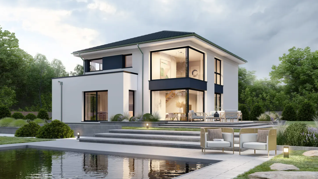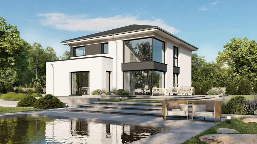 Dieses Fertighaus in hochwertiger Holzständerbauweise erfüllt höchste Ansprüche an Energieeffizienz, Wohnkomfort und Qualität.