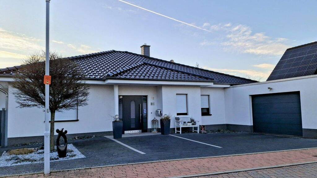 Ein sehr gepflegter Bungalow der Luxusklasse mit Fußbodenheizung, eleganter, multifunktionaler Küche mit Markengeräten und 2 Wohlfühlbädern. Die Winterabende können Sie vor dem prasselnden Kamin verbringen. Neben dem 47 m² großen Wohn- und Esszimmer , gibt es ein Schlafzimmer, ein Kinderzimmer und ein HWR. Im Dachgeschoss ist ein ca. 20 m² großes Gästezimmer ausgebaut, daneben befindet sich ein großer Abstellraum. Im Frühjahr und Herbst bietet sich der unbeheizte Wintergarten zum Aufenthalt an. Weitere Extras im Garten sind der hochwertige Jacuzzi und eine Fasssauna. Im Sommer ist es ein highlight unter den vier großen, schattenspenden Platanen, die kunstvoll in Spalierform geschnitten sind, zu relaxen. Das Rasenmähen erledigt der Mähroboter. Die Fasssauna und den Jacuzzi bietet das ganze Jahr über einen gewissen Luxus. Die große Doppelgarage und ein Holzhaus im Garten runden das Angebot ab. Es bleiben also keine wünsche offen.