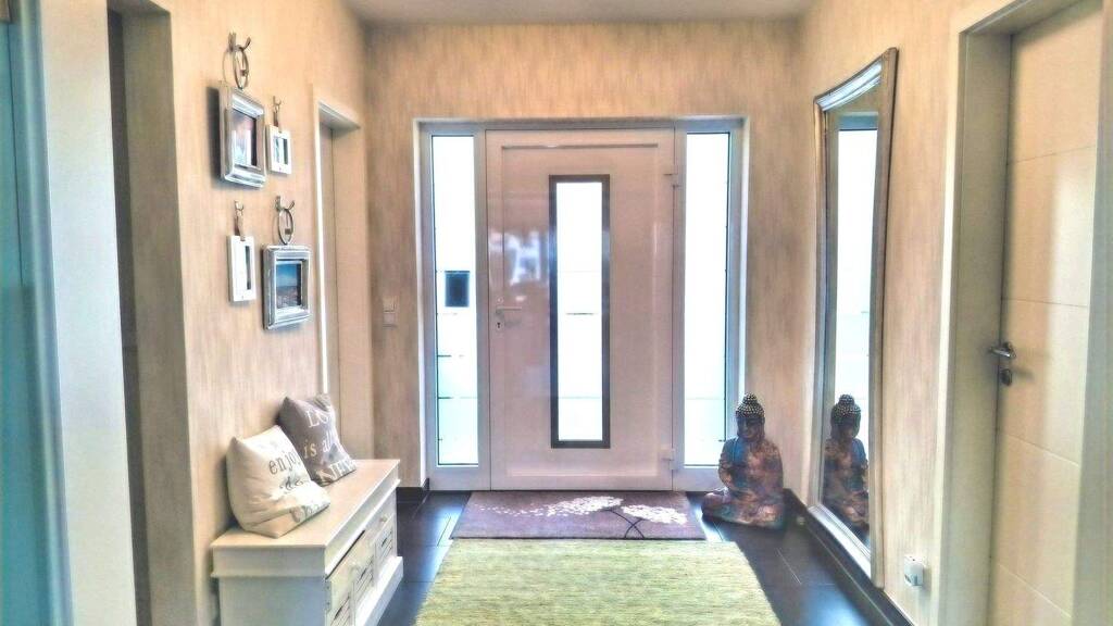 Fernwärmeheizung Fußboddenheizung und Handtuchtrocknerheizkörper im Bad Kunststofffenster, innen weiß, außen Schwarz überall Rollläden, z. T. elektrisch hochwertige, weiße Innentüren , silberne Türdrücker massive Bauweise mit Poroton und Kalksandstein leicht glasierte Dachziegel Doppelgarage mit Abstellmöglichkeiten 3 KFZ Stellplätze vor dem Haus im Garten: Fasssauna für 2 Personen, hochwertiger Jacuzzi, Gartenhaus geschmackvoll angelegter Garten mit Rasen, Solitärgehölzen und Spalierobst