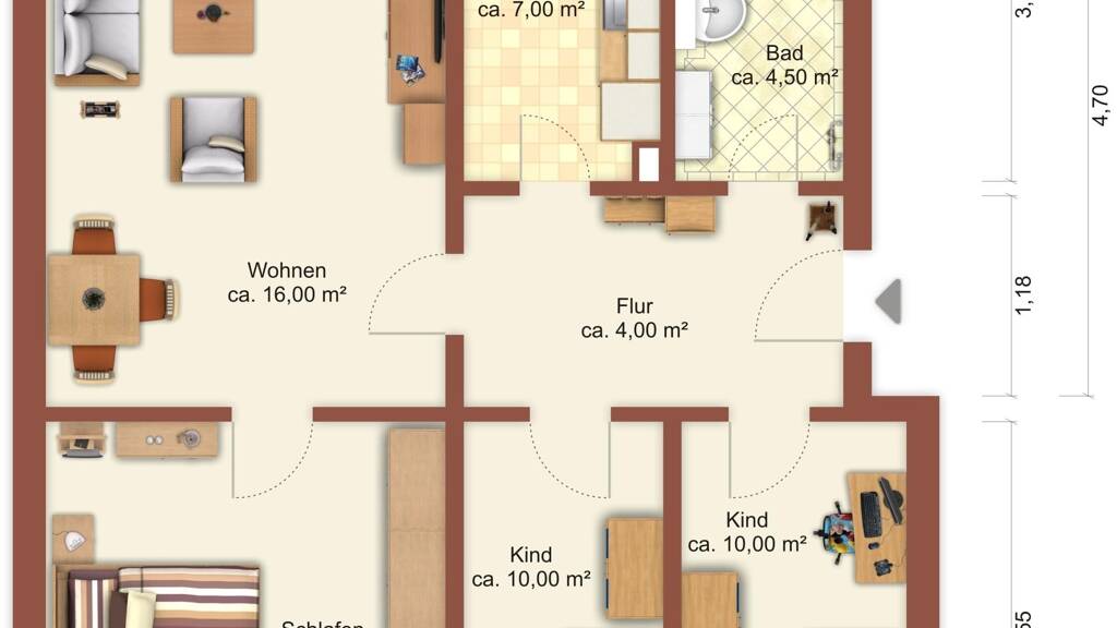 Die Wohnung wird vor Einzug vollständig renoviert. Das Bad wird zeitgemäß erneuert und mit Wanne ausgestattet. Die Wohnung verfügt außerdem über Wohnzimmer mit Balkon, Schlafzimmer, zwei Kinderzimmer, Küche und Flur.